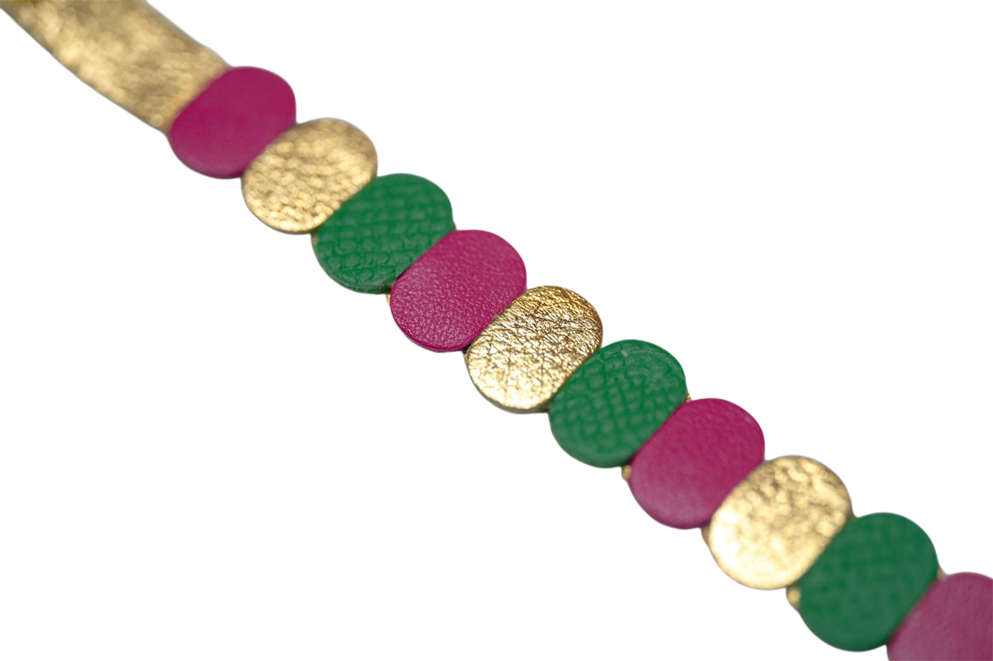 Plongez dans l’univers de la Collection Tricolore, une célébration du style à la française, où se rencontrent le doré lumineux, le vert sapin profond et le fuchsia vibrant. Ce bracelet unique joue sur les contrastes : chaleur, intensité et éclat, pour une allure à la fois chic, contemporaine et pleine de caractère.