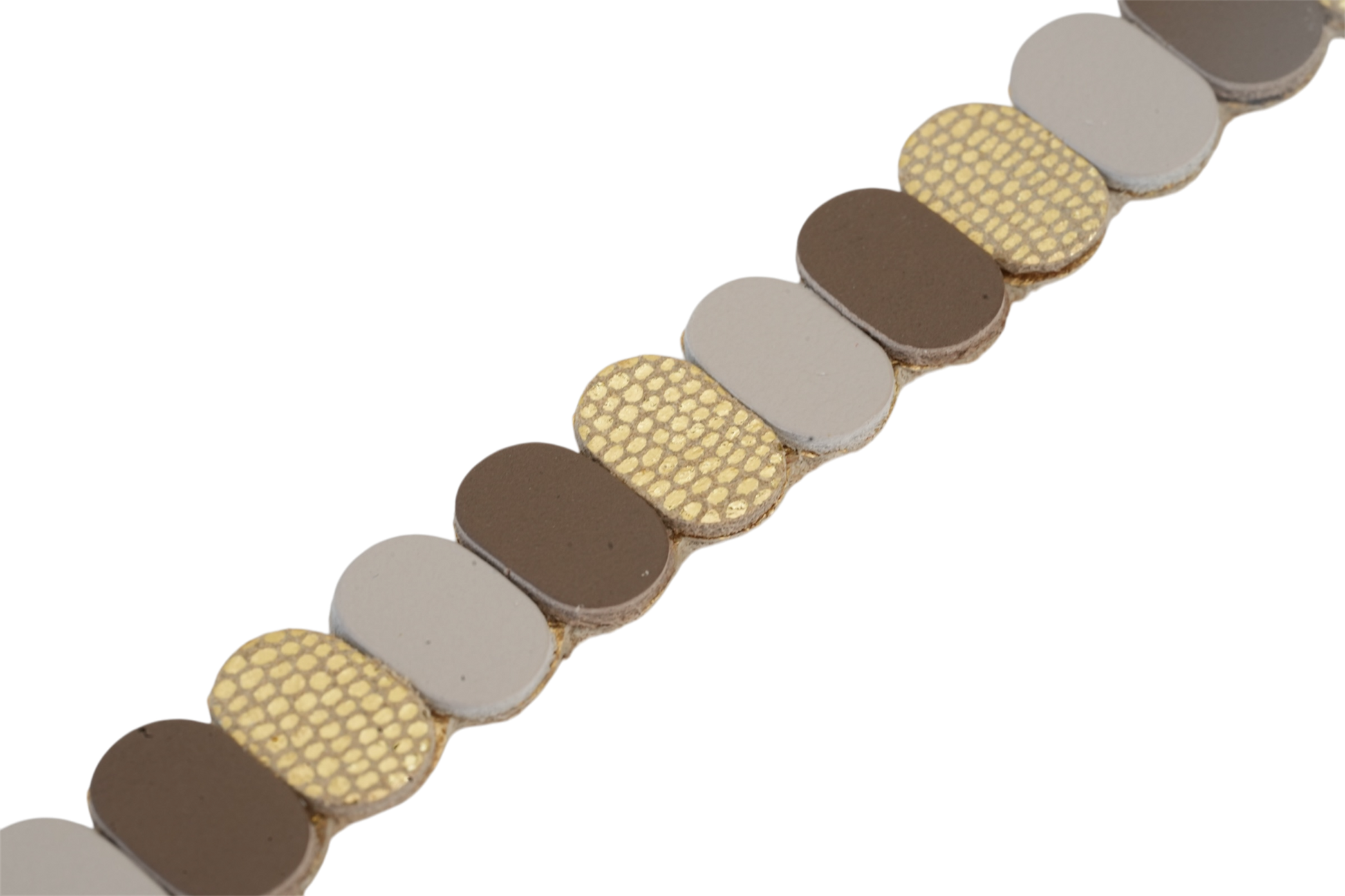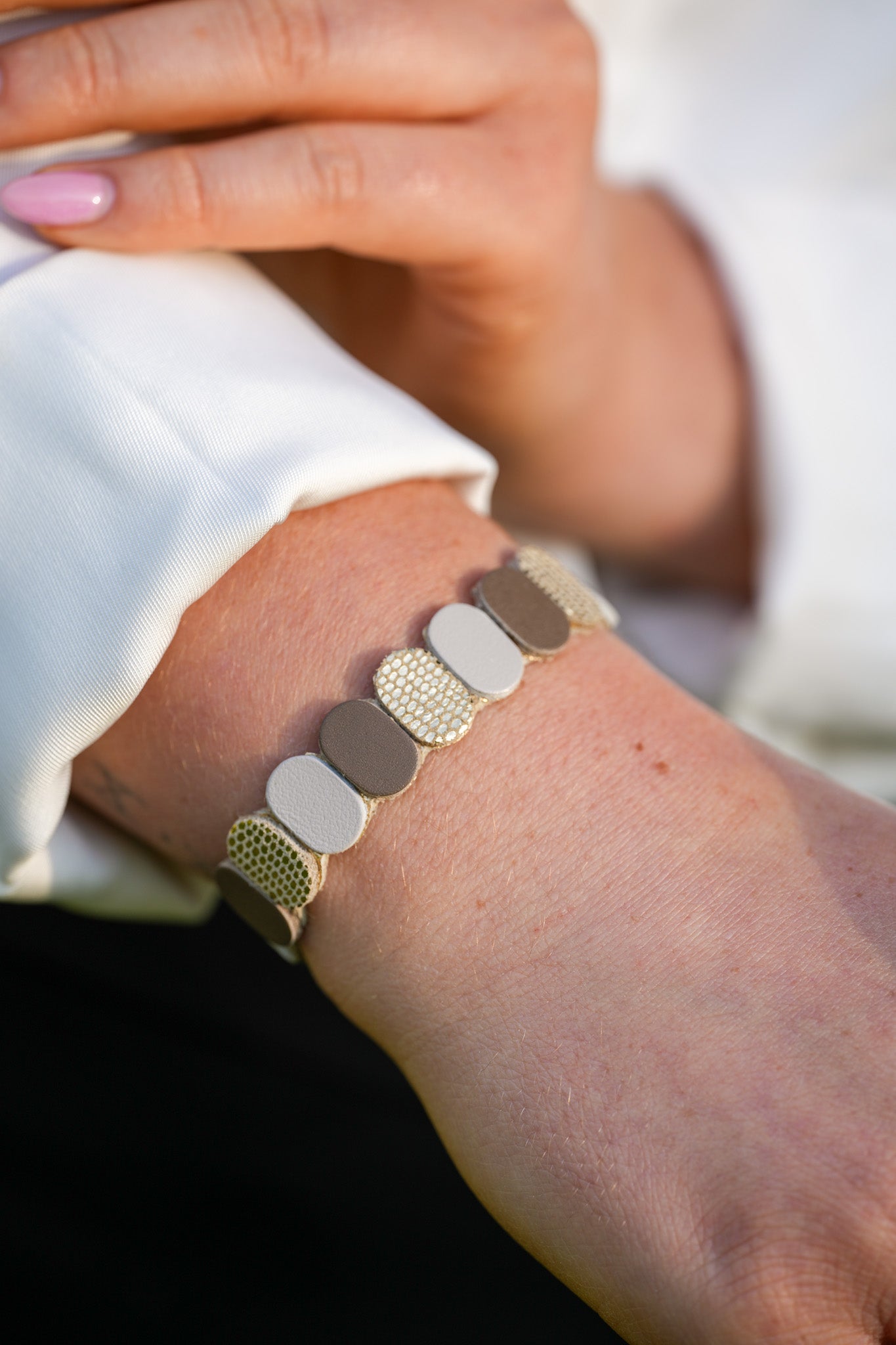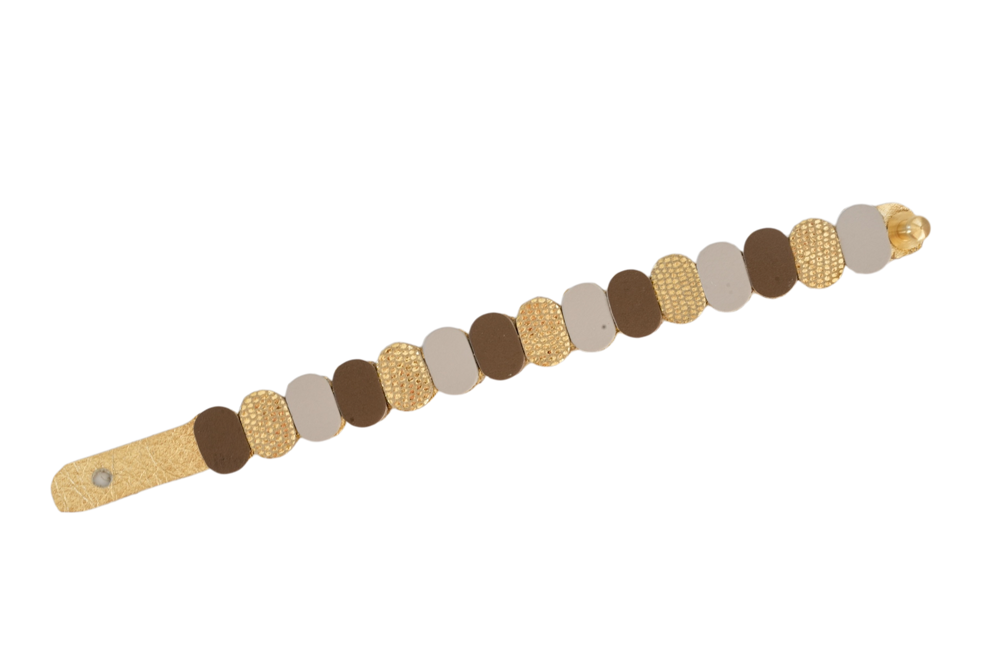Élégant et tout en subtilité, ce bracelet tricolore Maison Pevilia associe le doré lumineux à des tons taupe et gris clair pour un rendu à la fois doux et raffiné.