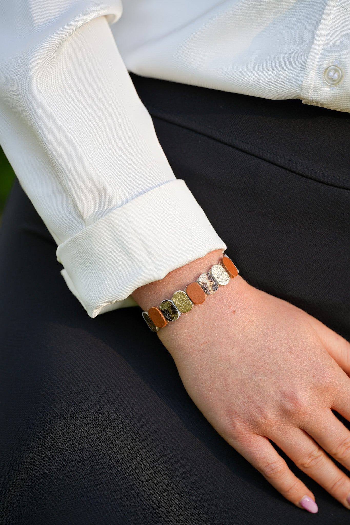 • Nos bijoux sont réglables ! Choisissez l'encoche qui vous convient et coupez l'excédent de cuir aux ciseaux si besoin.