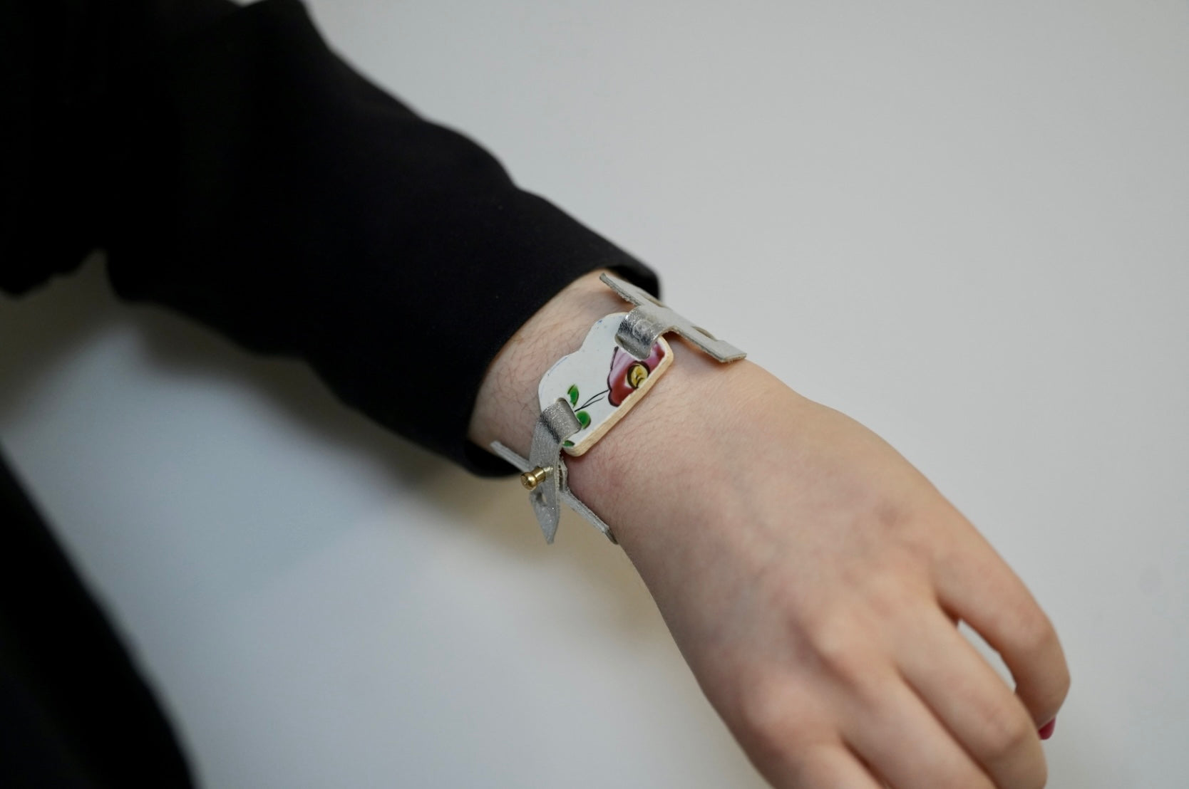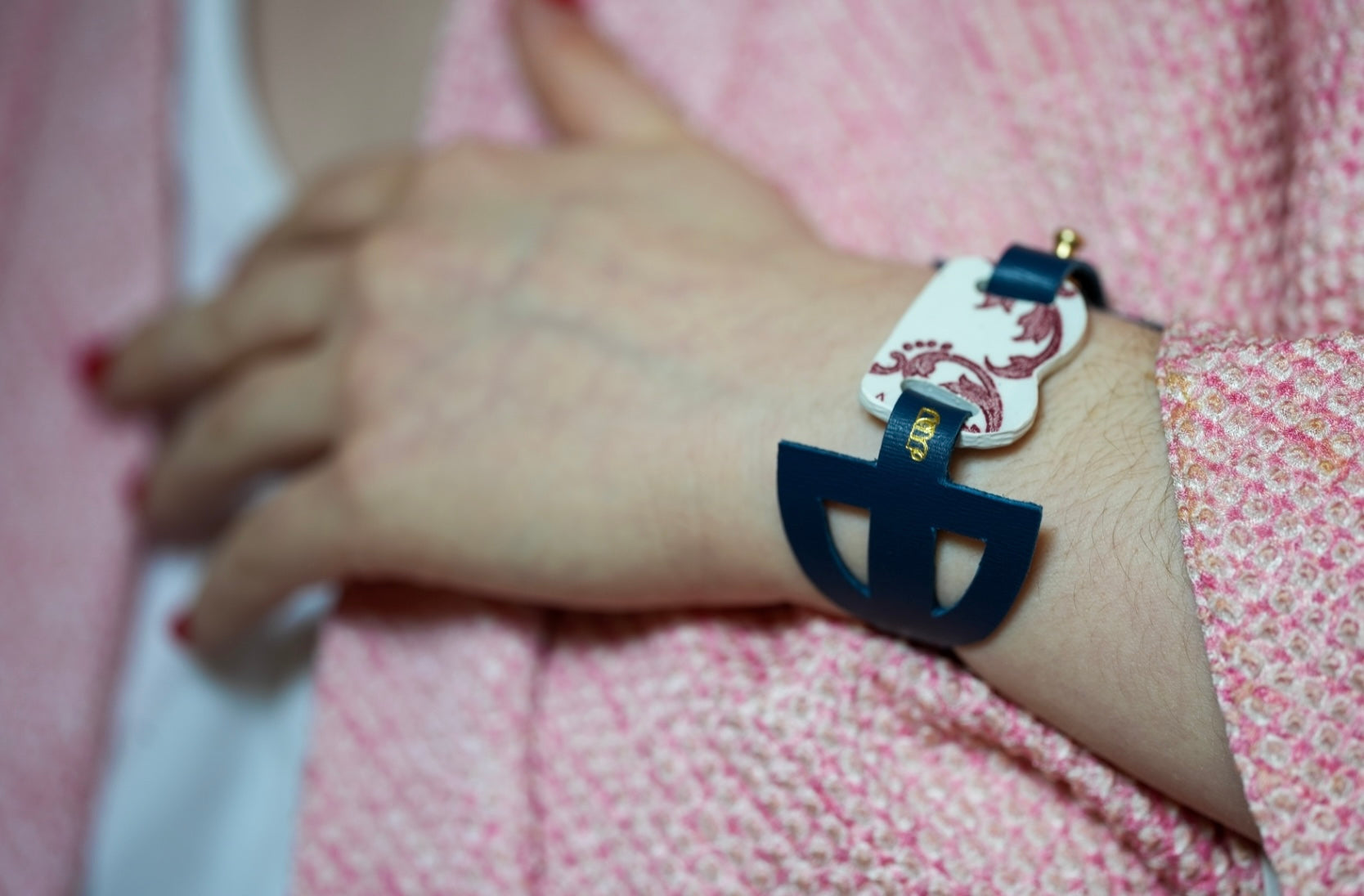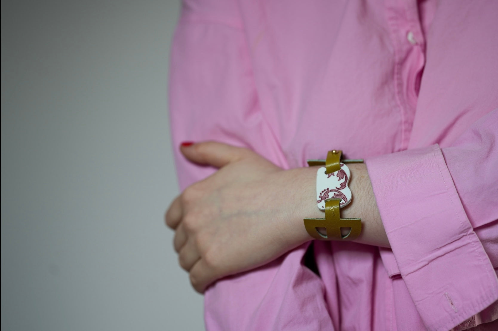 Paolina, la designer, sélectionne la faïence disponible en fonction des couleurs de cuir que vous avez sélectionnées, pour une pièce unique et harmonieuse.