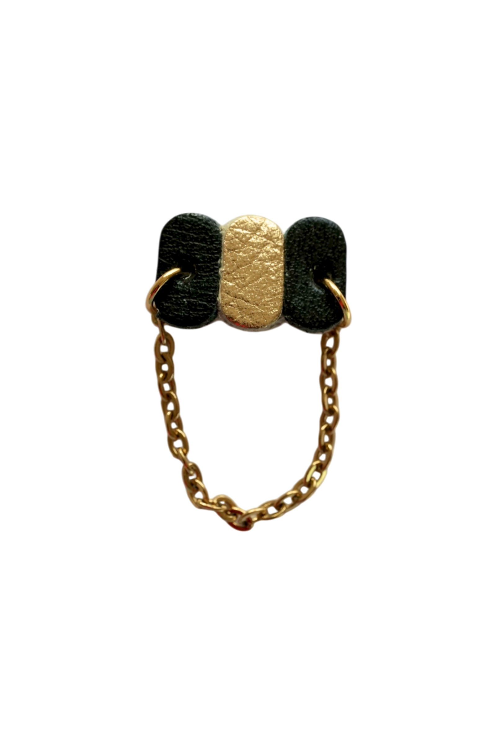 Tricolore réinvente la bague avec une chaîne souple qui épouse le doigt comme une seconde peau. Son design joue avec un assemblage de trois cuirs colorés, subtilement contrastés, créant une allure à la fois graphique et raffinée.